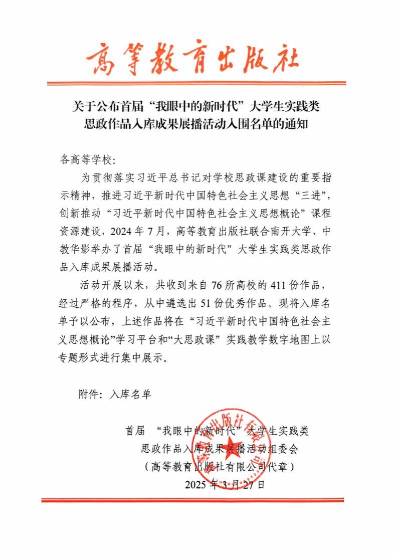 近日,高等教育出版社公布首届“我眼中的新时代”大学生实践类思政作品入库成果展播活动评选结果,蜜桃直播
